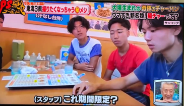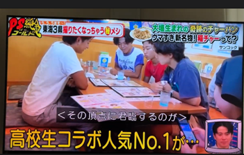 9月12日に放映されたのはサンコックさんに足を運んだ生徒たちが、別の高校のコラボメニューでレギュラー化されている「稲チャー」(チャーハンの上にもやしの台湾ミンチ炒めが乗ったものにたっぷりの山椒が効いてます)を食べ、レギュラー化への闘志を燃やしている様子でした。